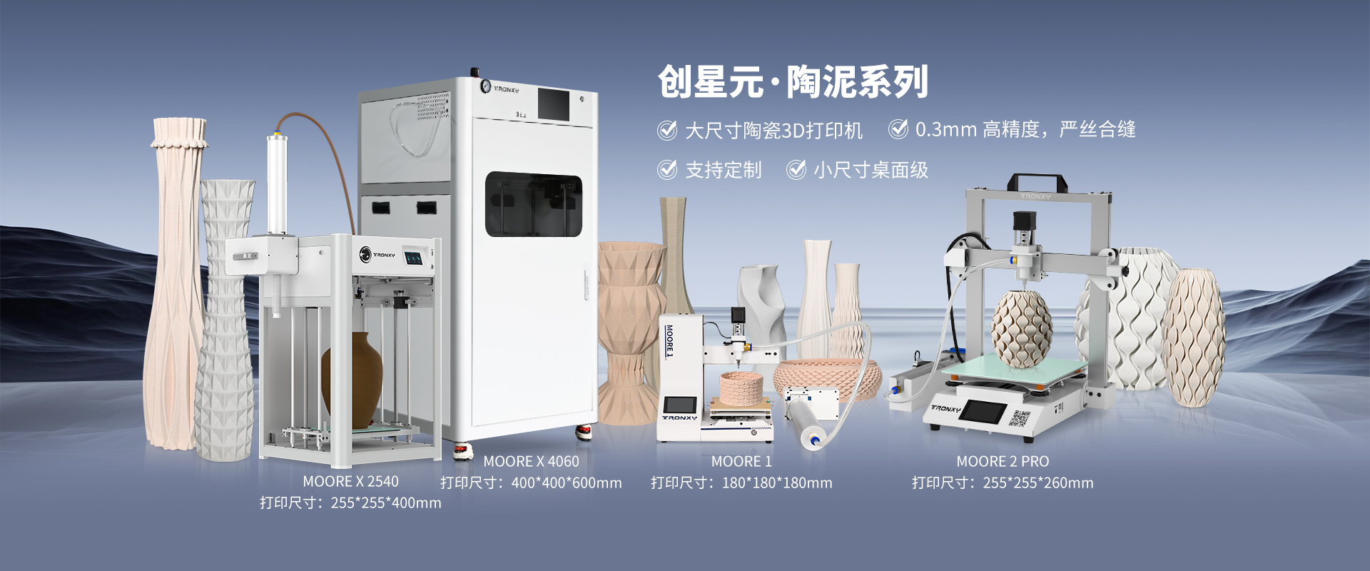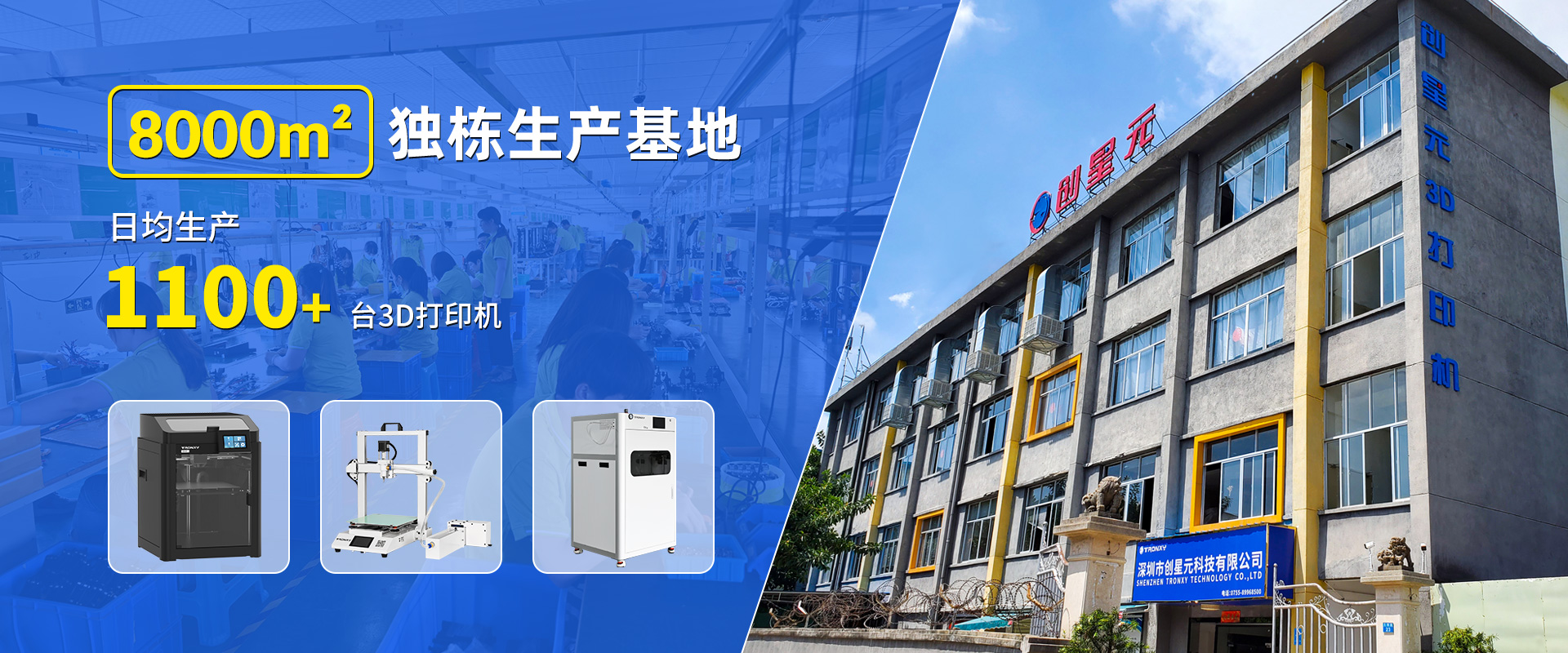 自主設(shè)計(jì),定制生產(chǎn)線,可生產(chǎn)從桌面級(jí)到工業(yè)級(jí)等 尺寸從180mm到1.6米的3D打印機(jī)